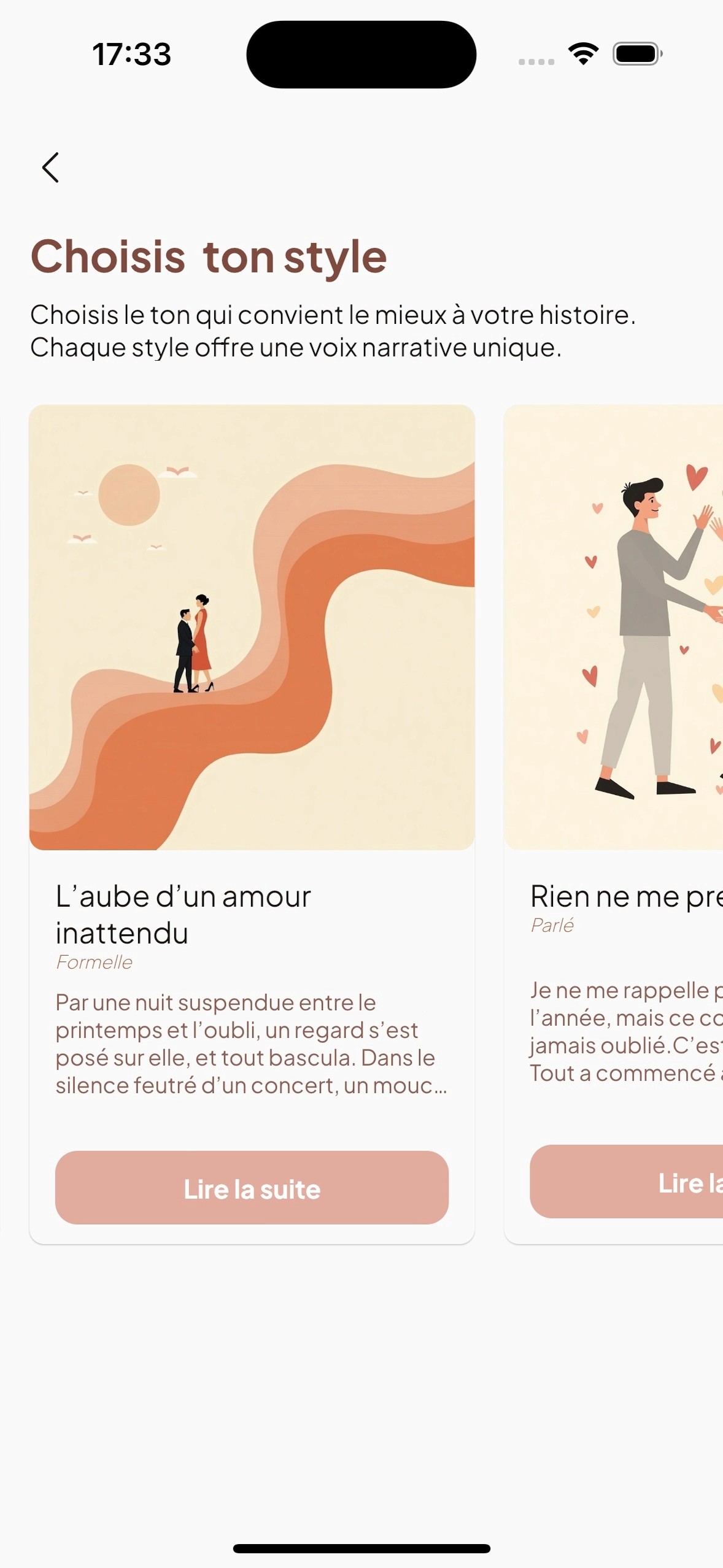 Nous reformulons ton histoire selon le ton qui te convient, pour une transcription parfaitement adaptée à la nature tes souvenirs.