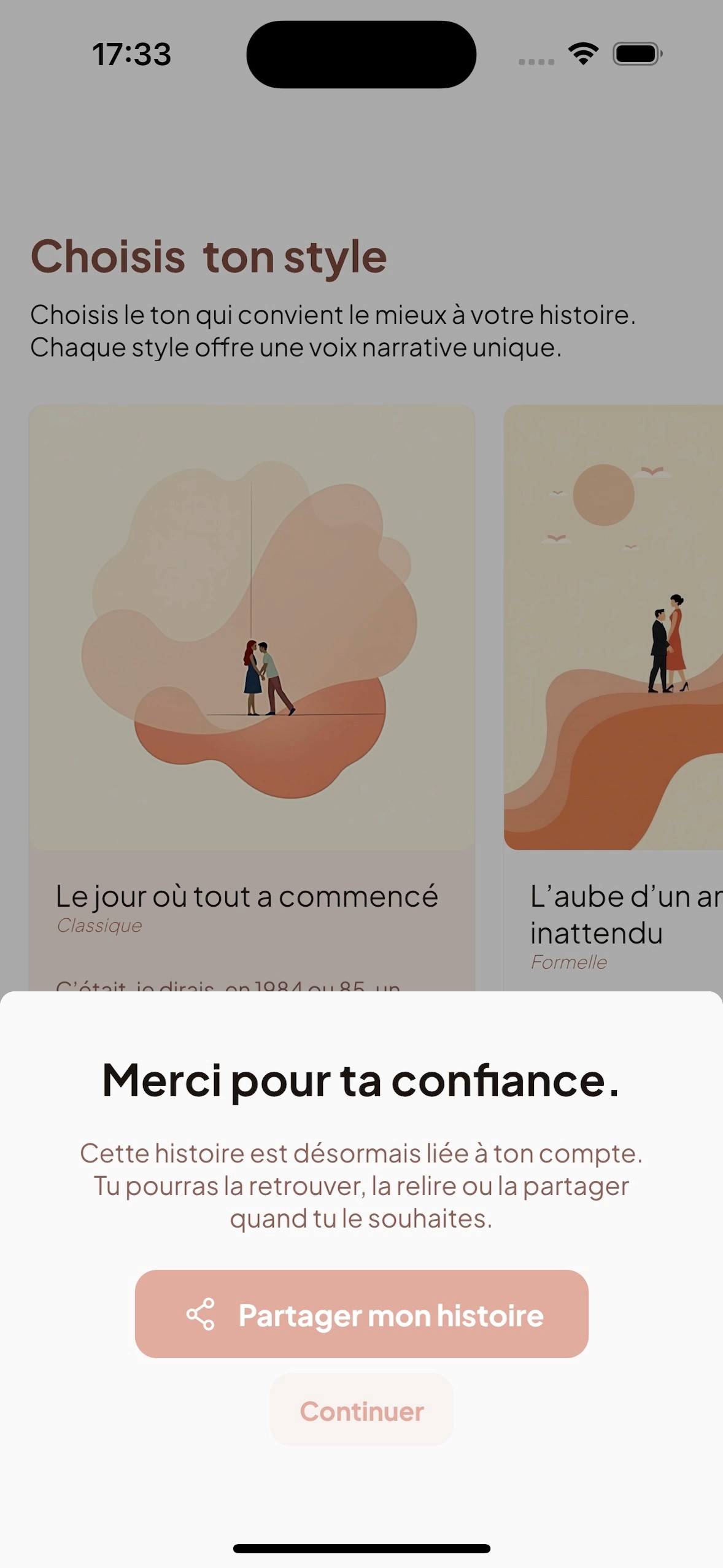 Reçois une histoire prête à lire, enrichie et illustrée. Partage-la en un clic avec tes proches via email, réseaux ou par messages. Notre IA de transcription garantit un partage sécurisé de tes récits, pour que tes souvenirs traversent les générations.