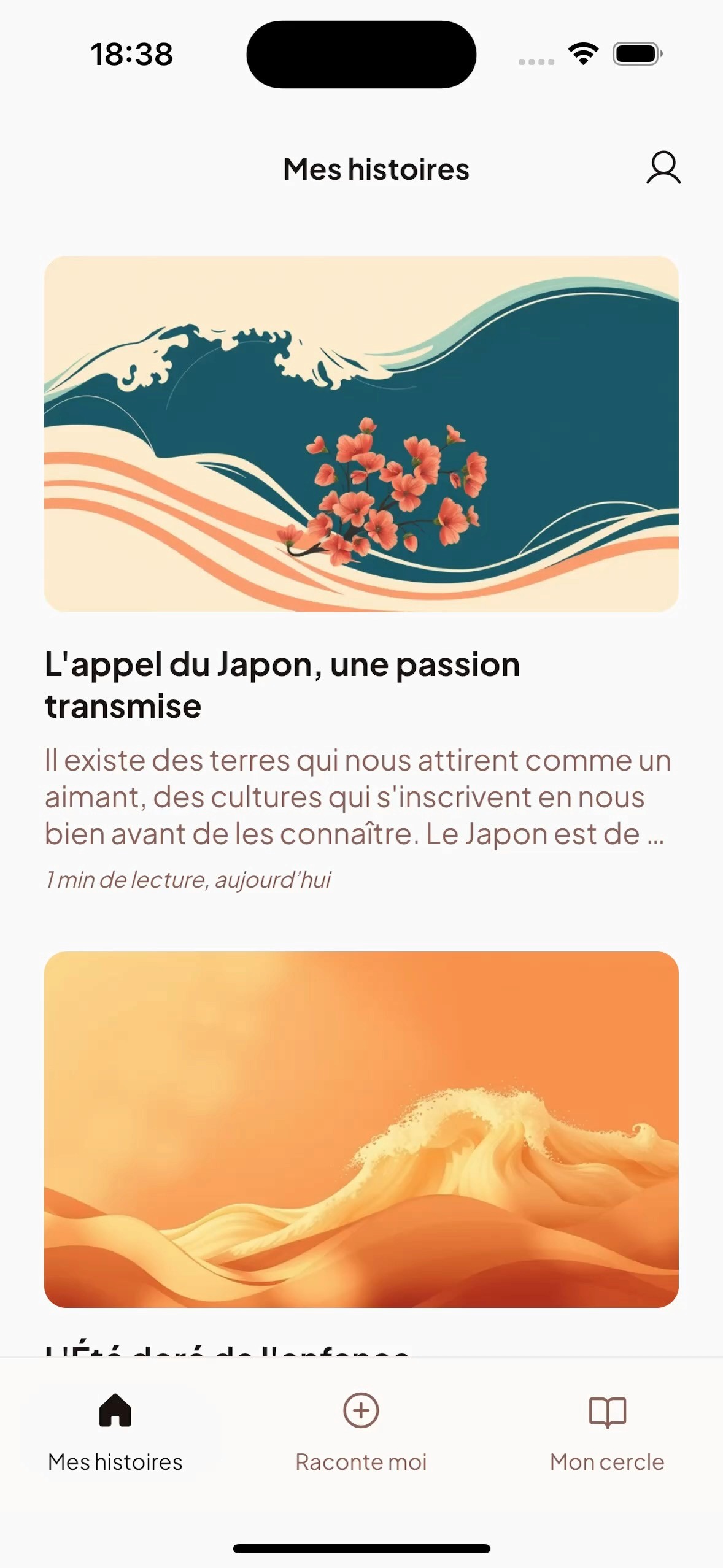 Raconte Moi est une application révolutionnaire d'IA gratuite qui transforme tes souvenirs dictés en histoires vivantes, structurées et illustrées. Tu parles simplement dans l'application, notre technologie de transcription vocale convertit ta voix en texte, puis l'IA organise et enrichit ton récit pour créer une histoire prête à partager. C'est le moyen le plus simple de préserver et transmettre tes souvenirs sans l'effort de l'écriture.